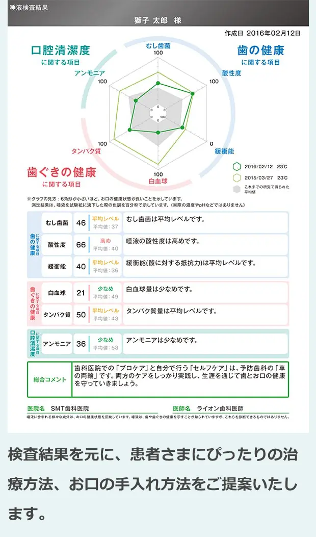 唾液検査をすることで、見た目だけでは分からない菌の数やタンパク質の多さ、唾液の酸性度などを数値化することができます。数値化することで虫歯や歯周病のリスクがわかるだけではなく、患者さまにあった治療やお口の手入れ方法をご提案することができます。