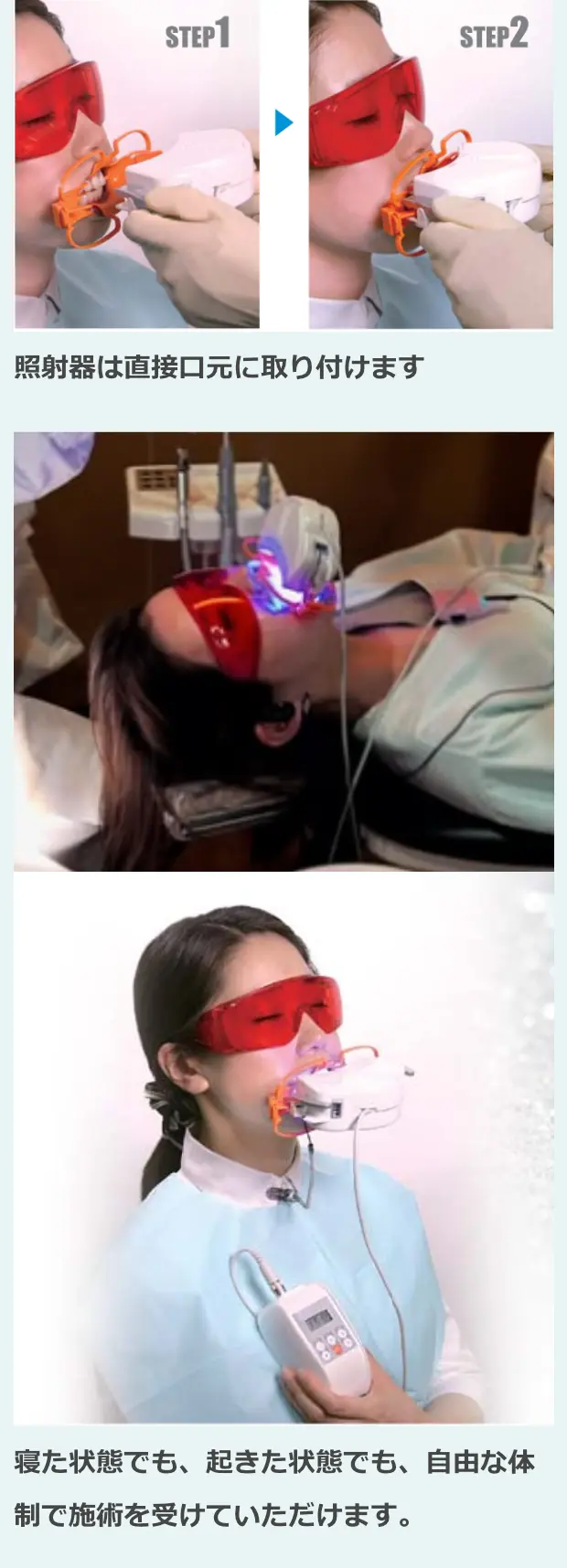 BRILLICA bianco(ブリリカビアンコ)は照射器を直接取り付ける新しいタイプのホワイトニングです。動いても照射位置が一定なので効率的な施術が可能になり、患者さまの「動いてはいけない」というストレスが軽減されます。従来型のスタンドタイプとは異なり、軽量・コンパクト、そして洗練されたフォルムのBRILLICAをぜひ一度お試しください。